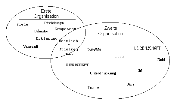 Aus der Perspektive dieser zweiten Wirklichkeit erscheint die Organisation vielleicht als beschützende Mutter, unter deren Dach sich die Organisationsmitglieder vor dem bedrohlich leeren Arbeitsmarkt verstecken. Oder als Raum, in dem sadistische Unterdrückung stattfinden darf. Oder als Möglichkeit, sich in einem Nirvana von Arbeit aufzulösen und zu erlösen. Jede erste Organisation hat ihre Zweite Organisation und umgekehrt. Die Zweite Organisation ist je nachdem beschaffen, was die Individuen der ersten Organisation als kleinsten gemeinsamen Nenner unerträglicher und uneingestehbarer Wahrheit empfinden.